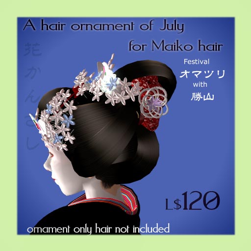 今回の七月の髪飾りは「お祭り」で、祇園祭の間にベテラン舞妓さんが結える「勝山」という髪型に変えれるアタッチも付いてます(アタッチタイプのため若干、異なりますが。。。)