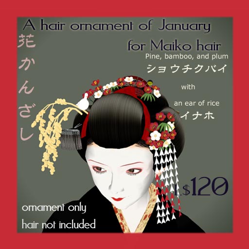 舞妓の髪を探すも、かれこれ1年以上前なのでSLにあるはずも無く、仕方なく自分で作る。最初はカンザシも髪に付いた状態だったんだけど、舞妓のカンザシは月ごとに昔から決まったモチーフのカンザシを付ける決まりで、へんな好奇心がムクムクっとでちゃったわけで。